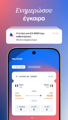 Με το AirHelp, παρακολουθήστε τις πτήσεις σας σε πραγματικό χρόνο. Λάβετε άμεσες ενημερώσεις για καθυστερήσεις, αλλαγές πύλης και οτιδήποτε αφορά το ταξίδι σας, εξασφαλίζοντας ότι θα παραμείνετε ενήμεροι. Το AirHelp είναι η ιδανική εφαρμογή για να υποστηρίξει κάθε σας αεροπορικό ταξίδι, προσφέροντας ηρεμία και ασφάλεια.