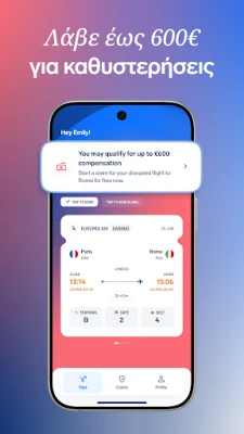 Σε περίπτωση που αντιμετωπίσετε διαταραχή πτήσης, όπως καθυστέρηση, ακύρωση ή υπεράριθμη κράτηση, το AirHelp σας παρέχει τη δυνατότητα να διεκδικήσετε εύκολα την αποζημίωση που ενδεχομένως δικαιούστε, έως και €600. Η διαδικασία είναι απλοποιημένη, χωρίς γραφειοκρατία, και η AirHelp αναλαμβάνει τα πάντα για εσάς, ώστε να επικεντρωθείτε στο ταξίδι σας. Για απόλυτη ηρεμία, αναβαθμίστε σε AirHelp+ και αποκτήστε πρόσβαση σε ολοκληρωμένη ταξιδιωτική ασφάλιση, προστασία αποσκευών, ακόμη και είσοδο σε lounge αεροδρομίου σε περίπτωση καθυστέρησης. Με την 24ωρη υποστήριξη της AirHelp, κάθε σας ταξίδι καλύπτεται πλήρως. Η AirHelp, ως η κορυφαία εταιρεία αποζημιώσεων πτήσεων παγκοσμίως, σας δίνει την αυτοπεποίθηση και τον έλεγχο που χρειάζεστε σε κάθε σας μετακίνηση.