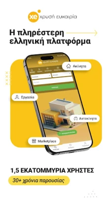 Το xe app αποτελεί την κορυφαία ελληνική πλατφόρμα για την ανακάλυψη ευκαιριών που αλλάζουν τη ζωή σας. Είτε αναζητάτε την ιδανική κατοικία, είτε την επόμενη επαγγελματική σας πρόκληση, είτε το όχημα των ονείρων σας, το xe app συγκεντρώνει ένα απίστευτο πλήθος καταχωρίσεων. Με πάνω από μισό εκατομμύριο ακίνητα – από σύγχρονα διαμερίσματα και νεόδμητες μονοκατοικίες μέχρι οικόπεδα και επαγγελματικούς χώρους – καθώς και χιλιάδες θέσεις εργασίας και μεταχειρισμένα αντικείμενα, προσφέρει μια ολοκληρωμένη εικόνα της αγοράς, απευθείας στην οθόνη σας.