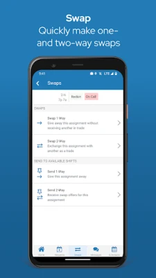 Η εφαρμογή QGenda ενισχύει την αυτονομία σας, επιτρέποντάς σας να υποβάλλετε και να παρακολουθείτε εύκολα αιτήματα για άδεια ή συγκεκριμένες βάρδιες. Η διαδικασία ανταλλαγής βαρδιών, τόσο μονόδρομη όσο και αμφίδρομη, γίνεται απρόσκοπτα μέσα από την εφαρμογή, ενώ οι διαθέσιμες βάρδιες εμφανίζονται καθαρά δίπλα στο τρέχον σας πρόγραμμα, δίνοντας τη δυνατότητα στους νοσηλευτές να αυτο-προγραμματίζουν τις επιθυμητές τους αναθέσεις. Επιπλέον, οι διαχειριστές μπορούν να ελέγχουν και να εγκρίνουν αιτήματα ανά πάσα στιγμή, και η ενσωματωμένη ανταλλαγή μηνυμάτων σας επιτρέπει να επικοινωνείτε γρήγορα με τους συναδέλφους σας. Για ακόμη μεγαλύτερη ευκολία, μπορείτε να συγχρονίσετε το πρόγραμμά σας με το προσωπικό ή οικογενειακό σας ημερολόγιο.